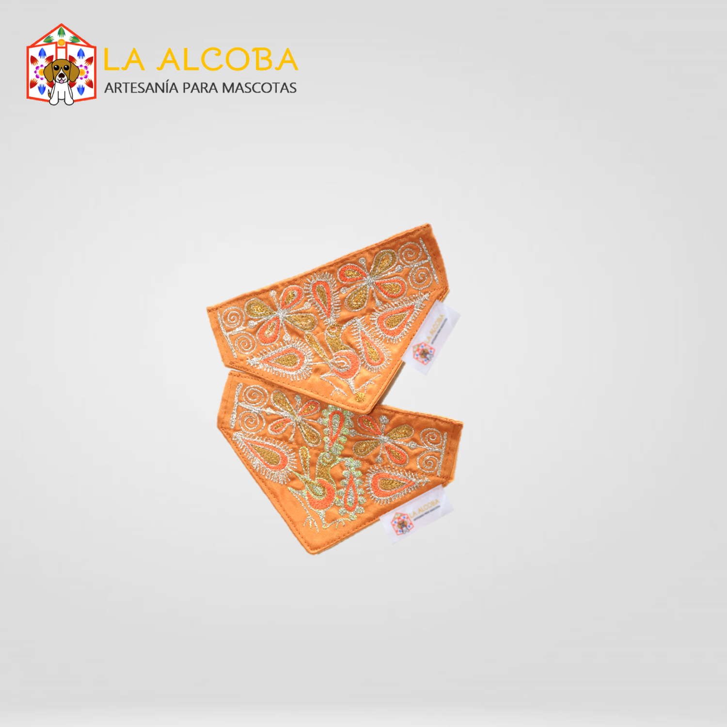 Bandana con costura embolsada. Aplicaciones en tela versage bordada a mano con iconografía del Valle del Colca. Viene con correa de cuero ajustable con argollas para portar identificador.
